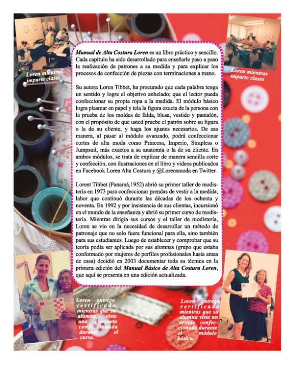 Su autora, Loren Tibbet, ha procurado que cada palabra tenga un sentido y logre el objetivo anhelado: que el lector pueda confeccionar su propia ropa a medida. En el m贸dulo b谩sico lograr谩 plasmar en papel y tela la figura exacta de la persona con la prueba de los moldes de falda, blusa, vestido y pantal贸n, con el prop贸sito de que usted pruebe el patr贸n sobre su figura o la de su cliente, y haga los ajustes necesarios. De esa manera, al pasar al m贸dulo avanzado, podr谩 confeccionar cortes de Alta Moda como princesa, imperio,聽strapless,聽halter, jumpsuit o wrap dress m谩s exactos a su anatom铆a o la de su cliente.