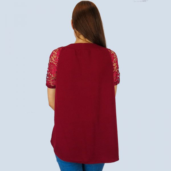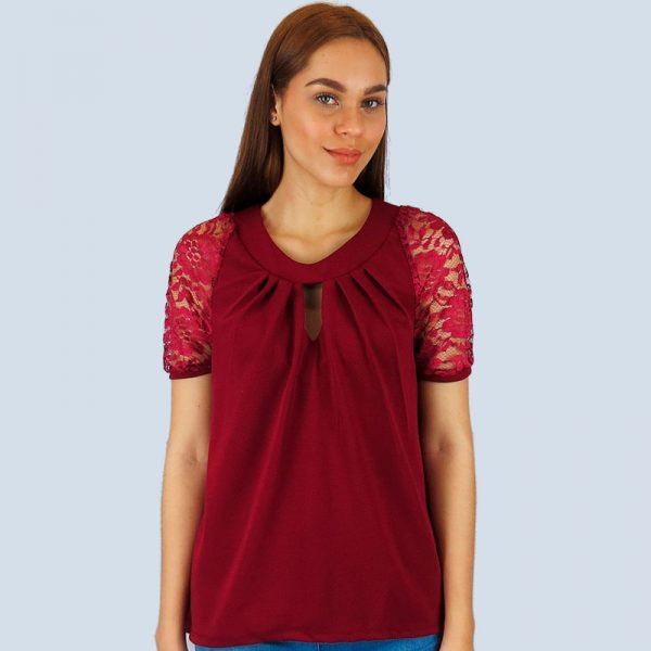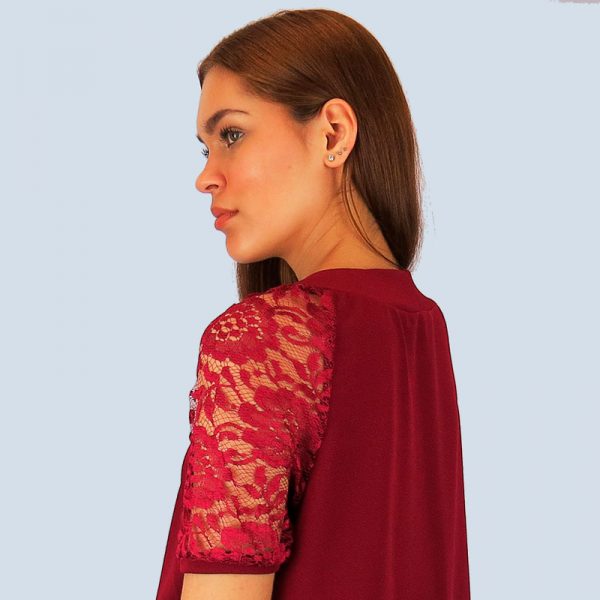 Top para una salida casual o un look diferente en la oficina confeccionado en Liverpool -textil elástico- con detalle de pliegues en el escote y mangas de delicado encaje.