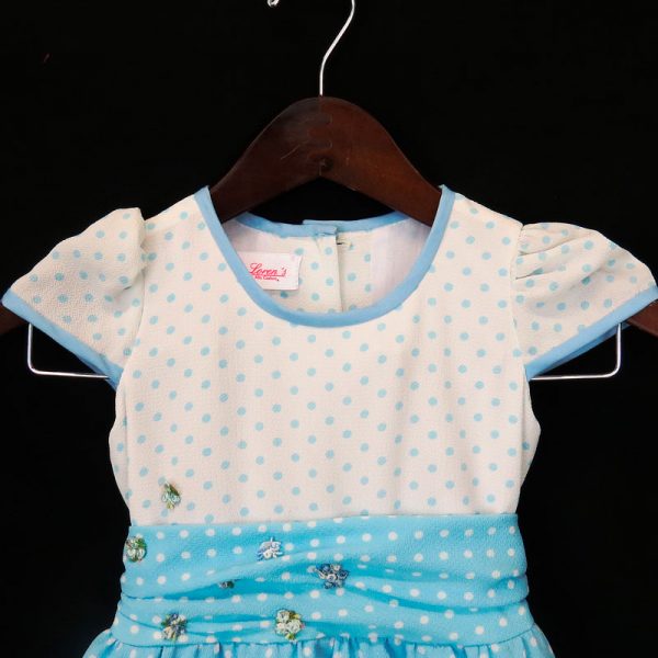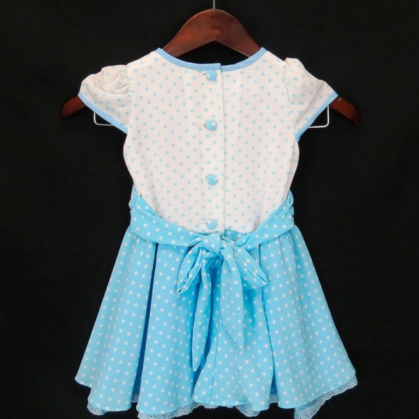 Curioso y fresco vestido en Tatiana Printed que juega con combinación de lunares a dos tonalidades, con detalle en escote y mangas con sesgos en color liso. En el corpiño detalle de fajón drapeado y adornado con flores de encajes y en la falda detalle de ruchas en encaje de letin. En la espalda se cierra con botones y lazo.